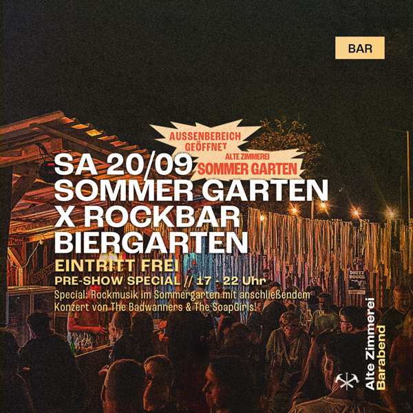Bevor am Abend The SoapGirls & The Badwanners live die Bühne übernehmen, öffnen wir schon ab 17 Uhr unseren Sommer Garten – diesmal als Rock-Biergarten! Der Eintritt ist frei!